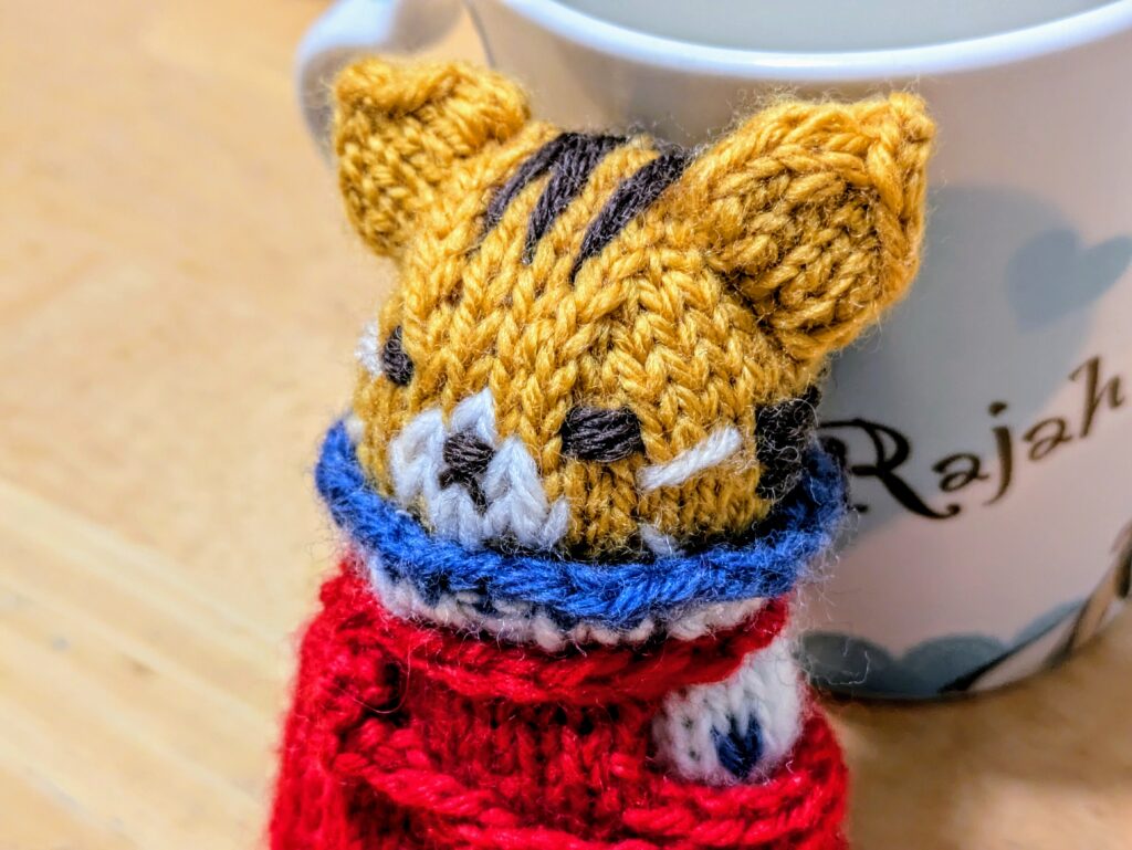 ネコの色違いも編みました。からし色のネコちゃんです。