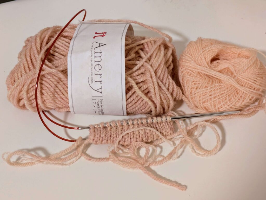 顔の部分のピンク色は、ハマナカアメリーと家にあったピンク系の極細糸を使用し2本取りにして編みました。